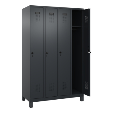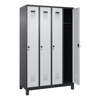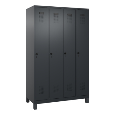 Spind Evolo PLUS mit hochwertiger Einbrennbeschichtung für hohe UV- und Korrosionsbeständigkeit. Geschlossene und abgeschrägte Seitenprofile für leichte Innenreinigung und komfortable Entnahme von Kleidung. Türen mit Soft-Anschlag und geschlossenen Seitenprofilen für höchste Stabilität, mit reinigungsfreundlichem Belüftungslochbild oben und unten. Aufhängung in stabilen Drehbolzen. Mit schwarzen, selbstklebenden Kunststoff-Etikettenrahmen, inkl. Klarsichtkunststoff-Abdeckung und weißem Etikett zur individuellen Beschriftung. Achtung: Anlieferungsmöglichkeit durch Sattelschlepper muss gegeben sein.