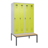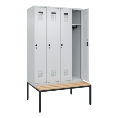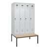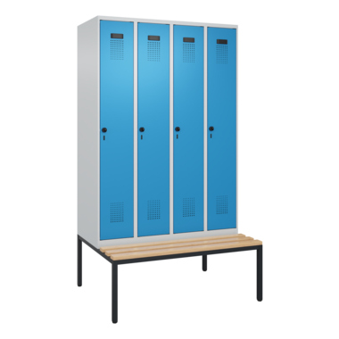 Spind Evolo PLUS mit hochwertiger Einbrennbeschichtung für hohe UV- und Korrosionsbeständigkeit. Geschlossene und abgeschrägte Seitenprofile für leichte Innenreinigung und komfortable Entnahme von Kleidung und Taschen. Geeignet für verdeckte Kabelführung. Mit hinteren Belüftungsöffnungen oben und unten. Innen 1 Ablageboden, darunter 1 stabile Garderobenstange aus Ovalprofil mit 3 verdrehsicheren Doppel-Schiebehaken. Inkl. Systemaufnahme. Sitzbank mit verstellbaren Bodengleitern für einfachen Niveauausgleich. Mit Türöffnungsbegrenzer, als Schutz vor Überdehnen der Tür. Türen rechts angeschlagen. Türen mit Soft-Anschlag und geschlossenen Seitenprofilen für höchste Stabilität. Aufhängung in stabilen Drehbolzen. 4 ergonomische Sicherheits-Drehriegel für Vorhangschlösser mit Bügelstärke 6 bis 8 mm. Mit Kunststoff-Etikettenrahmen, schwarz, selbstklebend, inkl. Klarsichtkunststoff-Abdeckung und weißem Etikett zur individuellen Beschriftung. Achtung: Anlieferungsmöglichkeit durch Sattelschlepper muss gegeben sein.