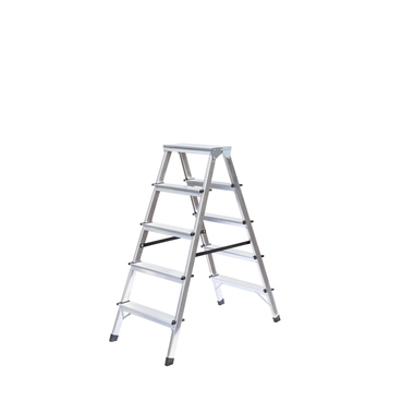 Haushaltsleiter beidseitig begehbar. 80 mm tiefe, geriffelte Stufen. Rutschsichere Leiterschuhe. Spreizsicherung mit zwei hochfesten Polyestergurten. Für den beruflichen Gebrauch zugelassen und geeignet.