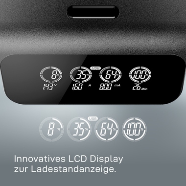 Anwenderoptimierte Lader mit Einzelschachtladung, benutzerfreundlichen Displays und hochwertigem Design. 2 Modi: Laden und Auffrischen. Einzelschachtladung für höchste Flexibilität und beste Ladeergebnisse. Displayanzeige: V, mAh und Minuten. Verbesserte Erkennung von defekten Zellen. Zusätzlicher USB-Ausgang um externe Geräte zu laden. Ladezeit basierend auf 2 x AA/Mignon 1.600 mAh. Die Leistung kann variieren. Ein Sicherheitstimer schaltet nach einer bestimmten Zeit ab, unabhängig vom Ladestatus.